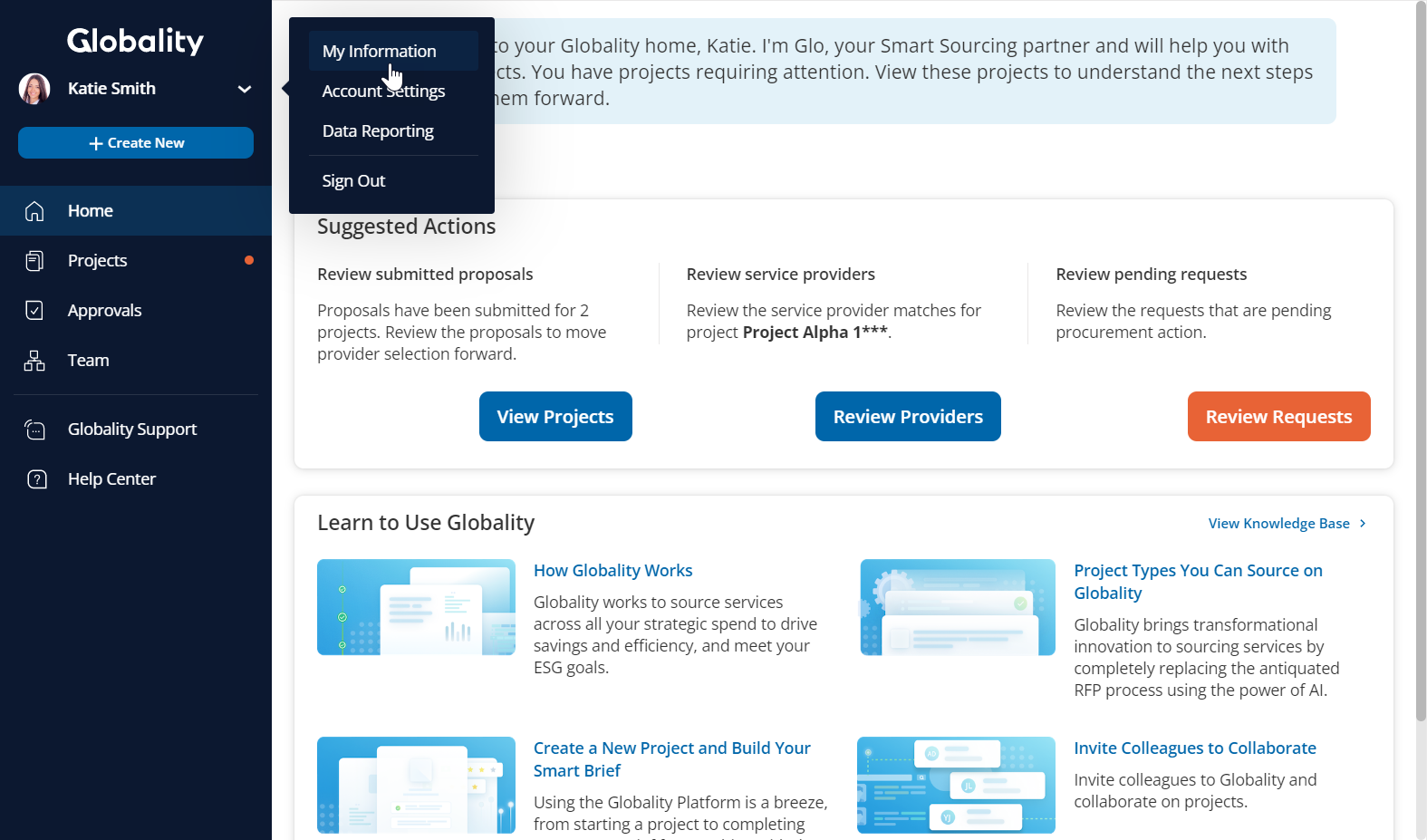 The main menu is always available on the left-hand side. From here you can access your home and settings, start a new project, view all your projects, approvals, manage your team, chat with Globality Support, and access the help center.