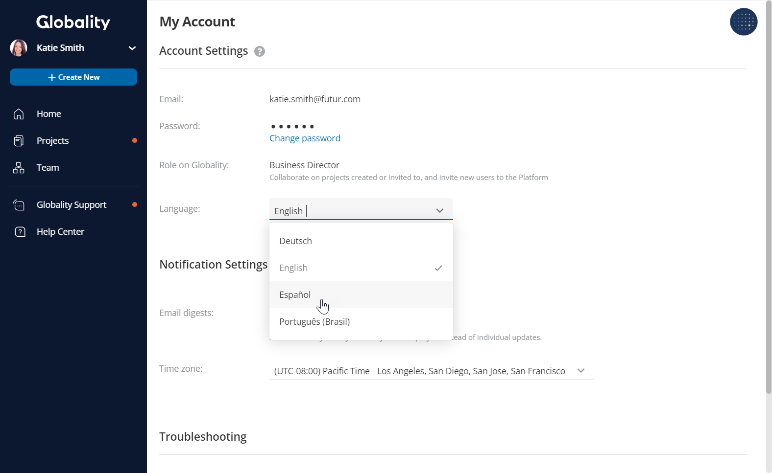 To change the Platform’s interface language, click on your profile picture in the main menu and go to your "Account Settings" to select your preferred language. The Platform currently supports English, German, Spanish, and Portuguese. The Platform's interface such as the main menu, project navigation panels, account settings, and team settings will appear in the language selected.