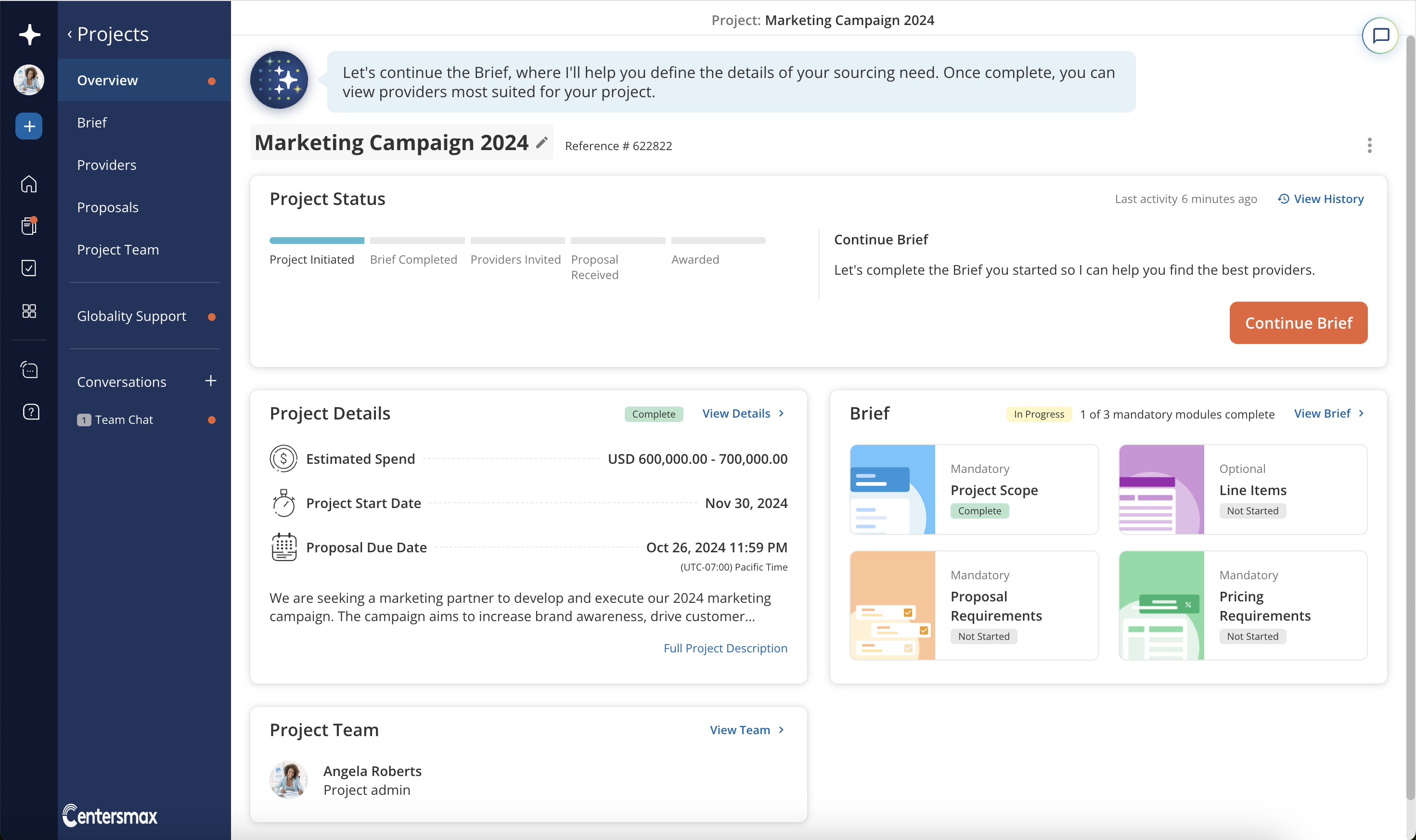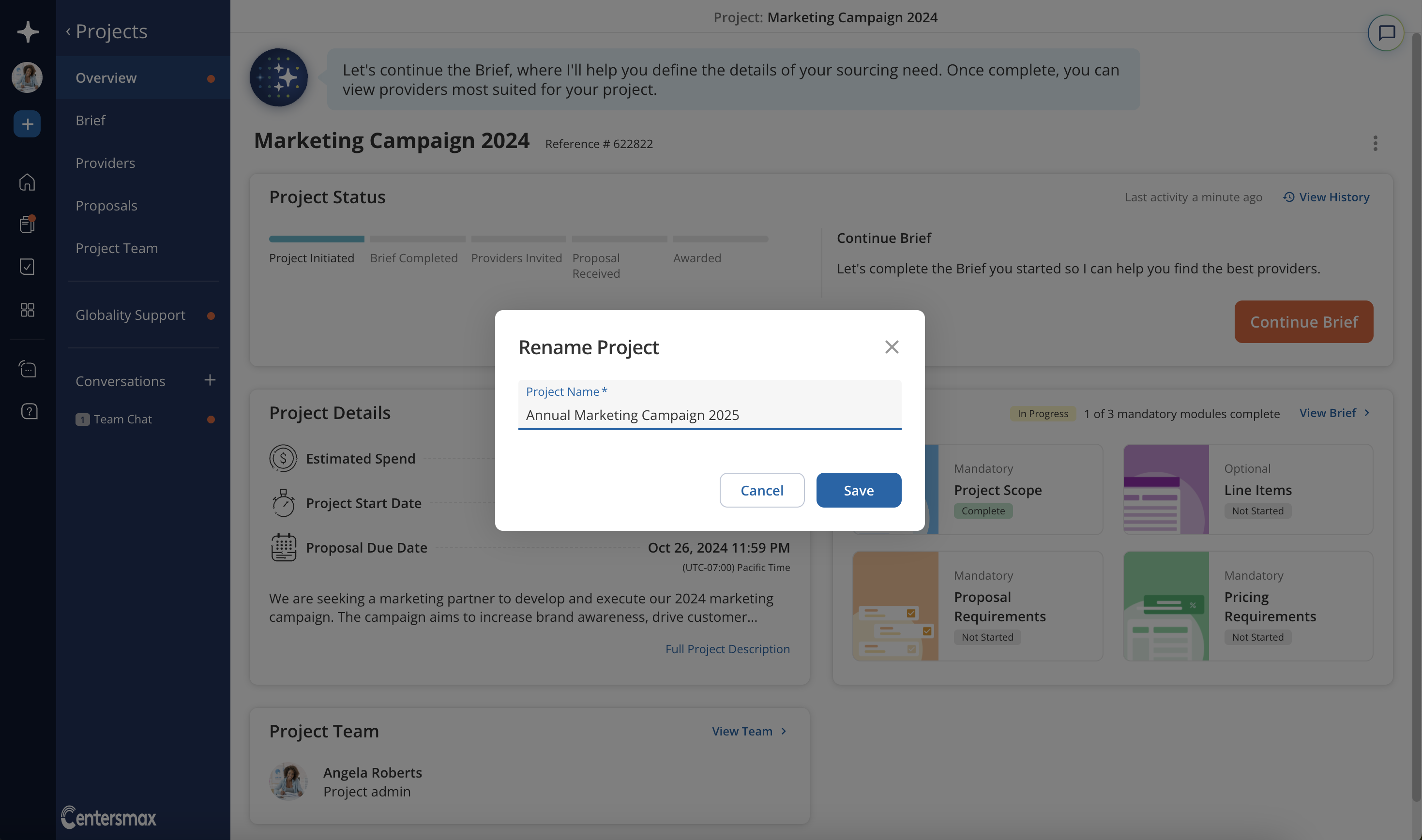 You may change the project's name at any time directly from the Project Overview page. Hovering over the project name in the Project Overview will expose a pencil icon that you can click to edit the project name. Alternatively, you can click on the dropdown menu in the Project Overview and select "Rename Project". In the window that pops up, you may rename your project and save the change.