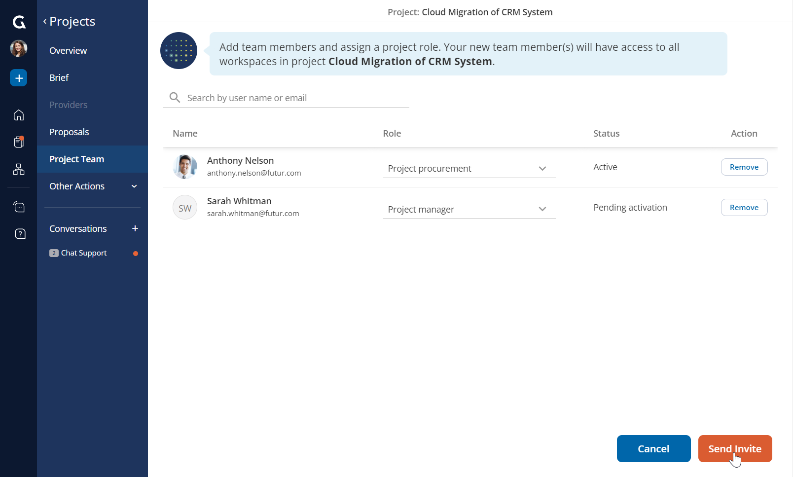 4. Once you have added all your team members, click the “Send Invite” button to confirm. Your invited colleagues will receive an email notification letting them know they have been invited to your project. Based on the role assigned, your project team members will have different access and editing permissions. We recommend that you communicate what actions you would like them to take with your project and use the chat functionality to collaborate.