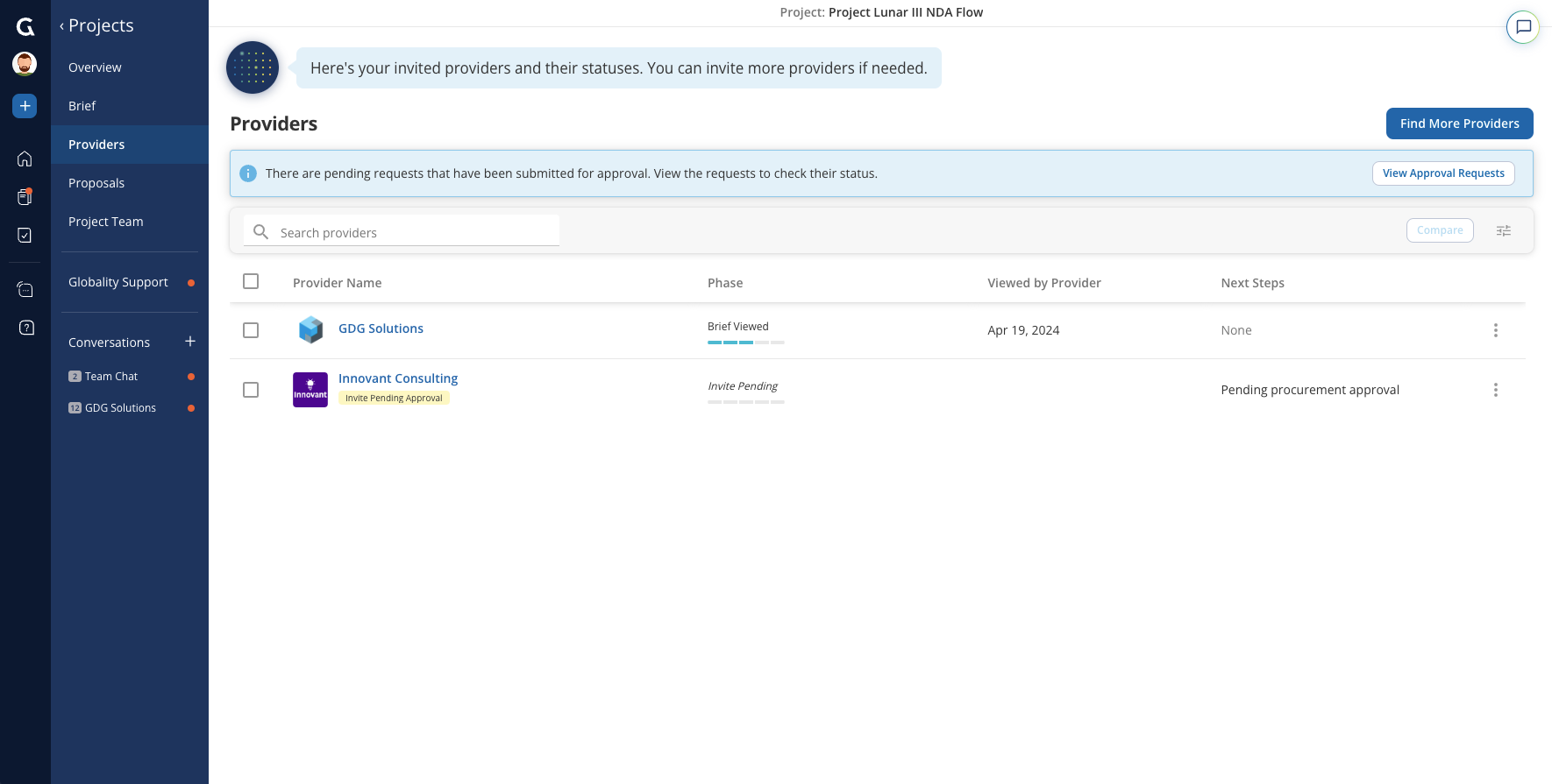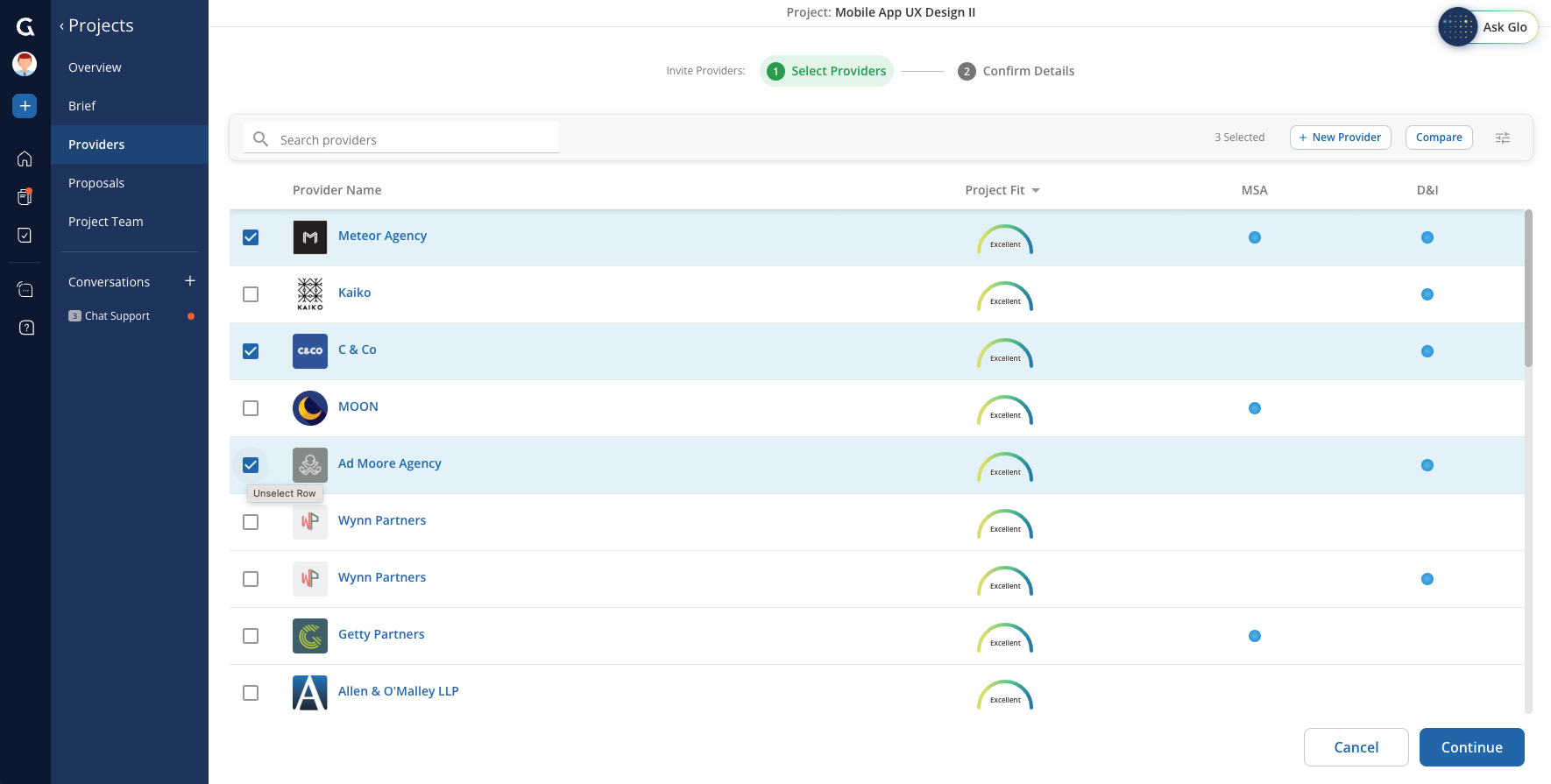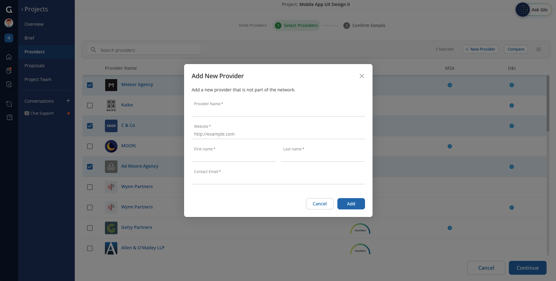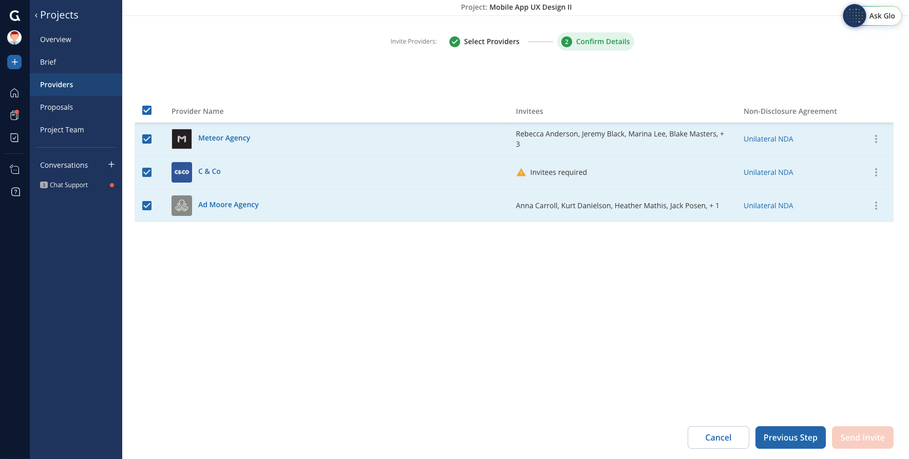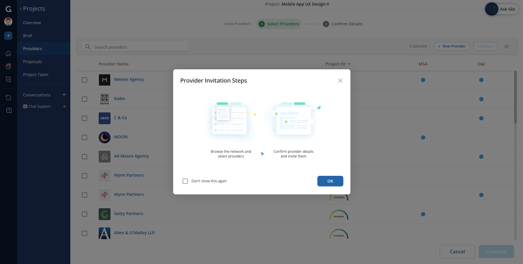 1. Once your project brief is completed, Glo will prompt you to find providers to invite to your project. You can also click on “Providers” in the navigation panel to find providers.