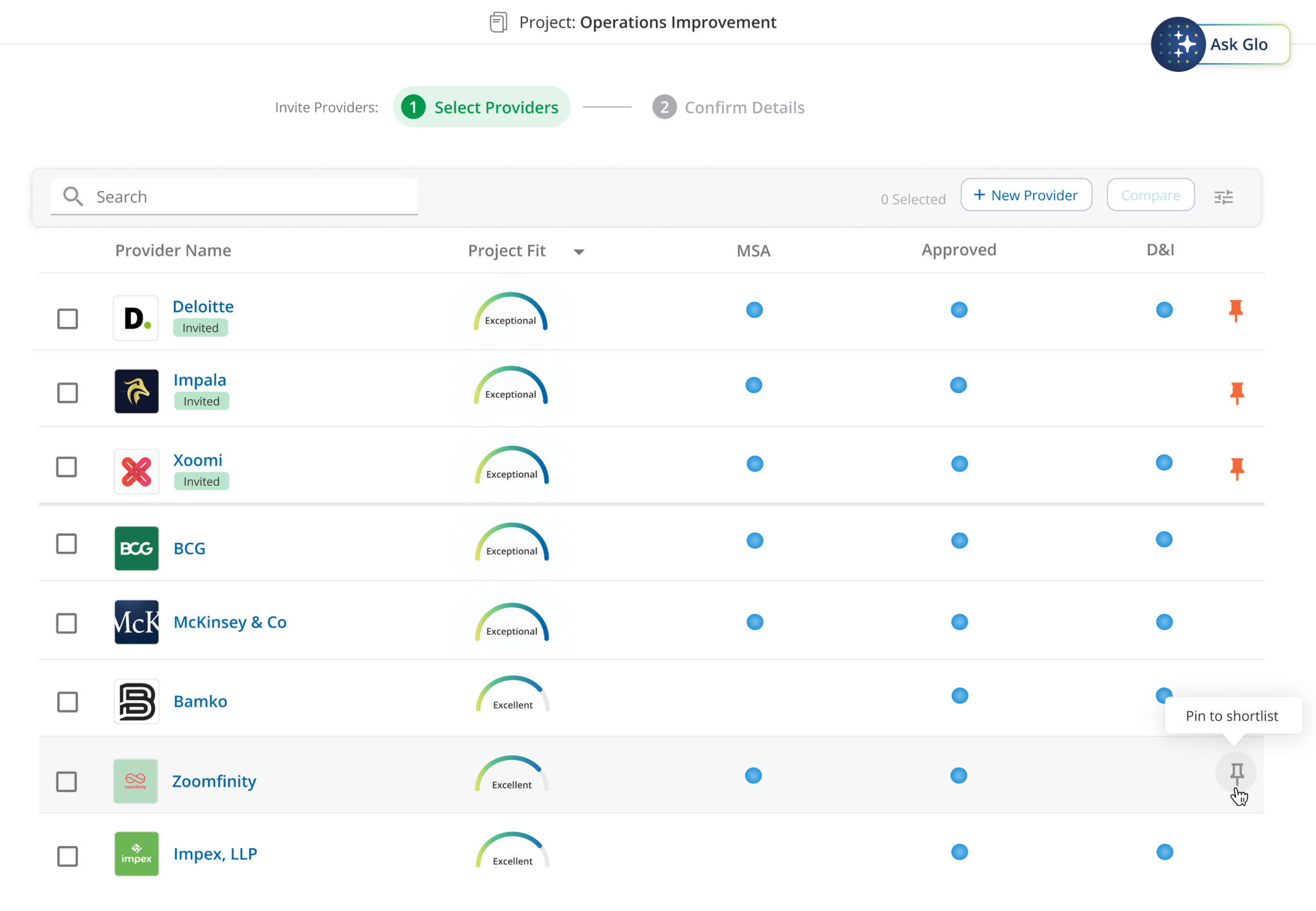 After clicking “Find Providers” from the Brief or the “Providers” tab on the left hand side, Glo will display your provider matches for your project.
