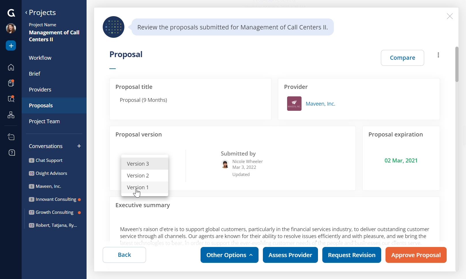 Yes. You can view previous versions of a provider's proposal. Click on the "Proposals" link in the project navigation panel and select the proposal you wish to view. The latest version number is shown on the top and if you click on it, you can select previous versions.