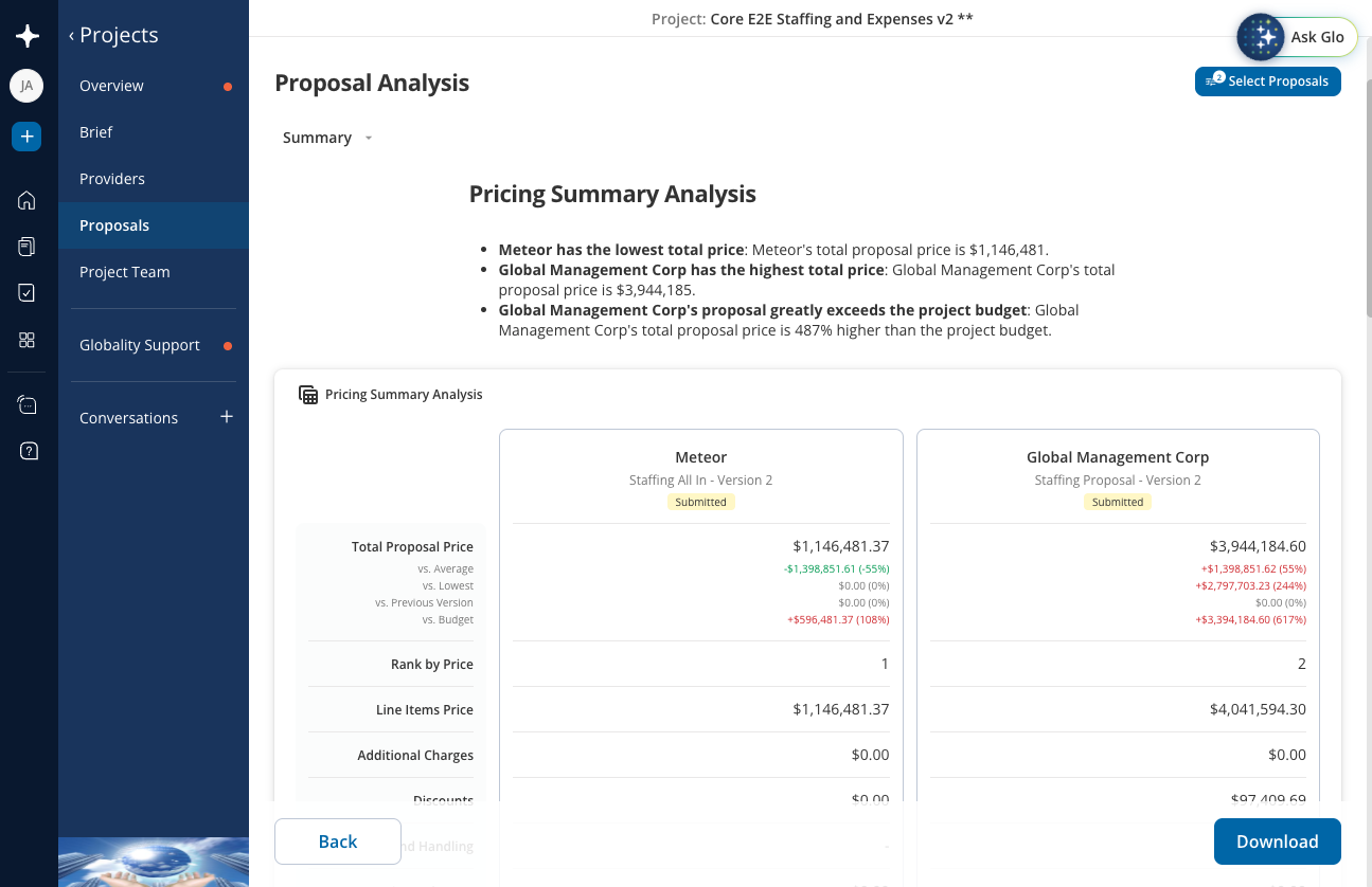 Glo generates the pricing summary analysis when project’s pricing type is “Unit Pricing with a Total Price” or “Total Price Only”. This analysis is an expansion of Glo's AI-generated proposal insights, allowing you to dive deeper into the pricing within the providers' submitted proposals.