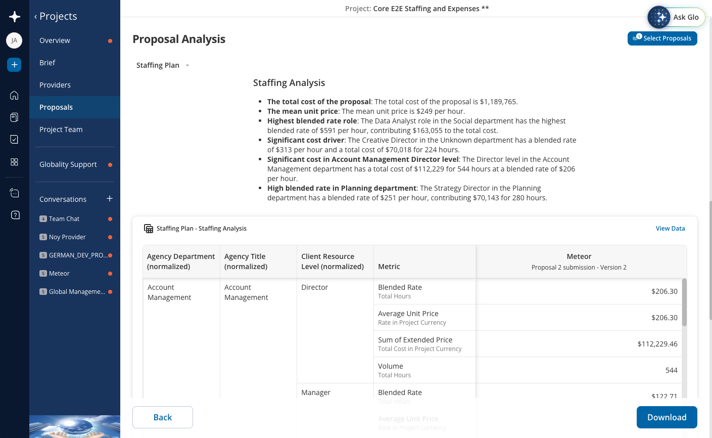 Glo generates the staffing analysis when proposals contain staffing related pricing.
