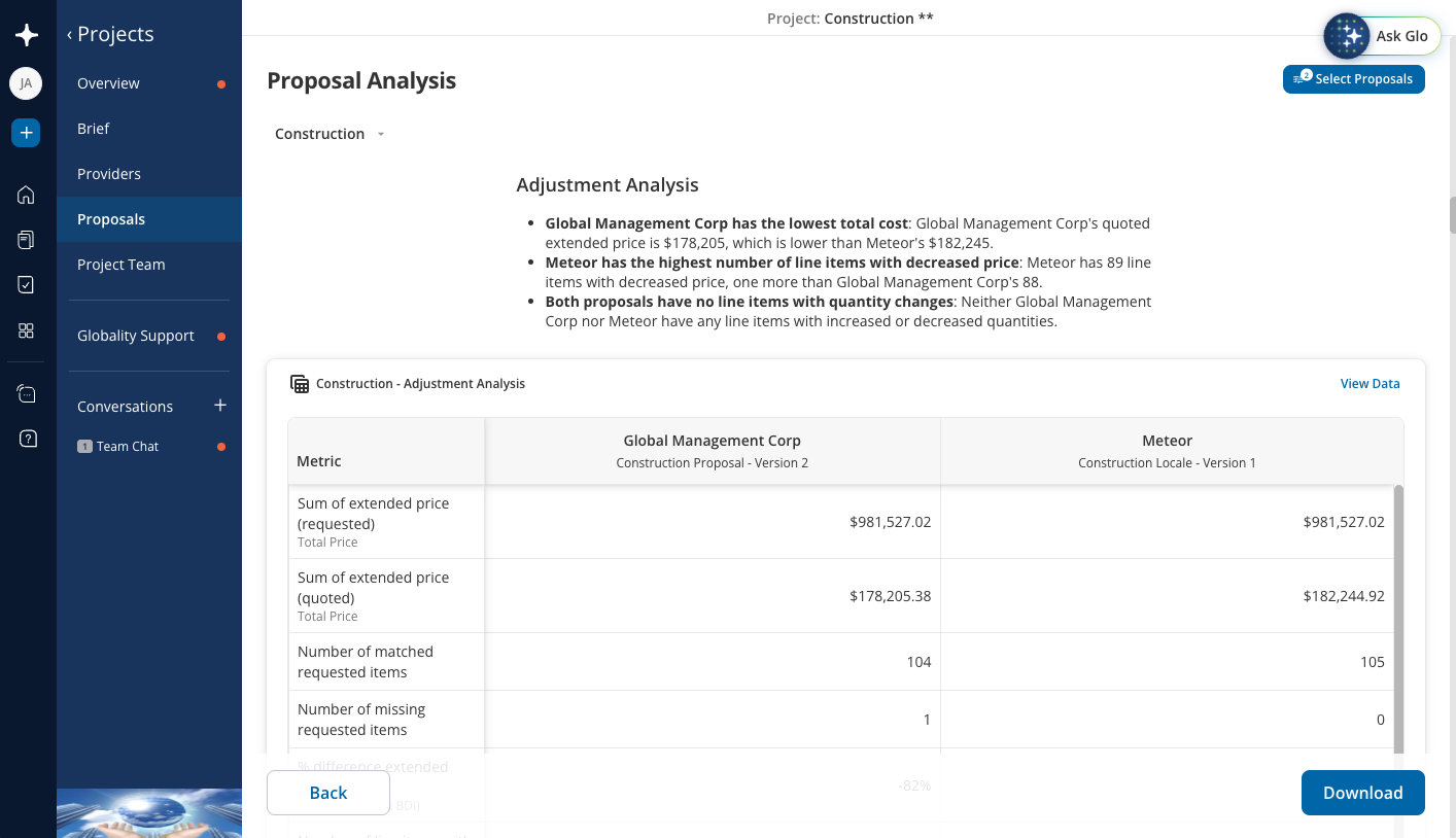 Glo generates the line item adjustment analysis when client includes line item requirements along with quantity and pricing in their project Brief.