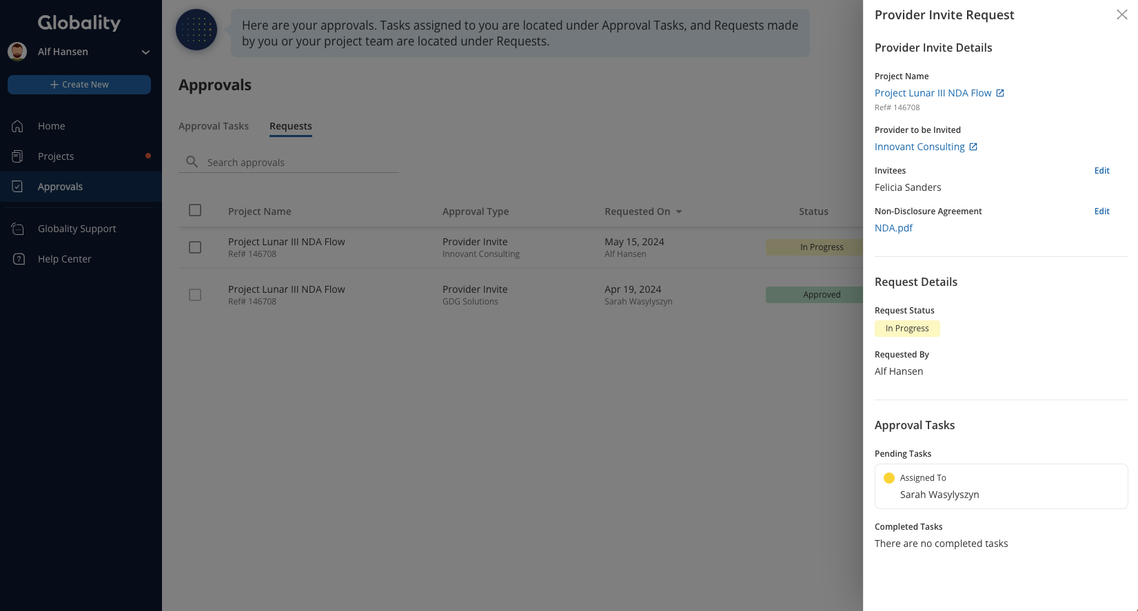 3. Click on an approval request to view pending and completed approval tasks in a side panel.