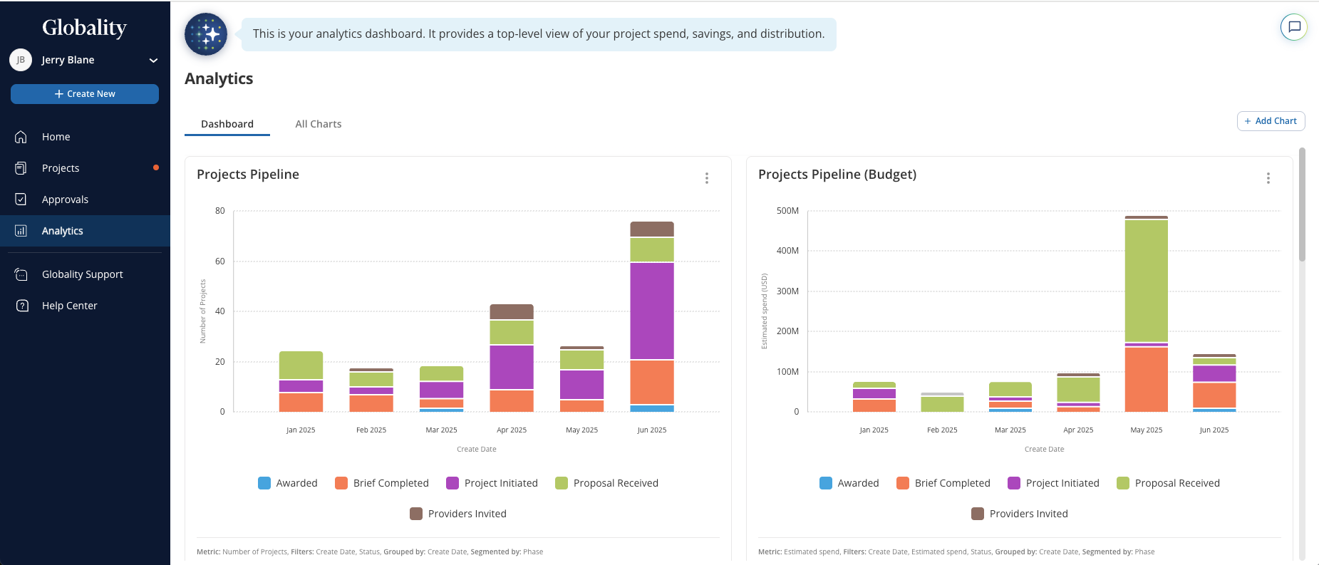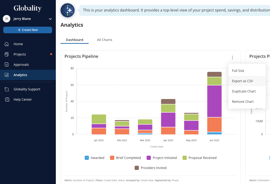 Globality provides an Analytics feature which allows users to curate a dashboard of charts detailing activity on the Globality platform over time. Users can create a library of charts and add those charts as needed to their dashboard. These charts can provide an overview of projects on the platform, including their budget and number of invited providers. Additionally, charts can be generated to show total awarded spend for projects on the platform. Users can also export the data from charts as needed for further analysis.