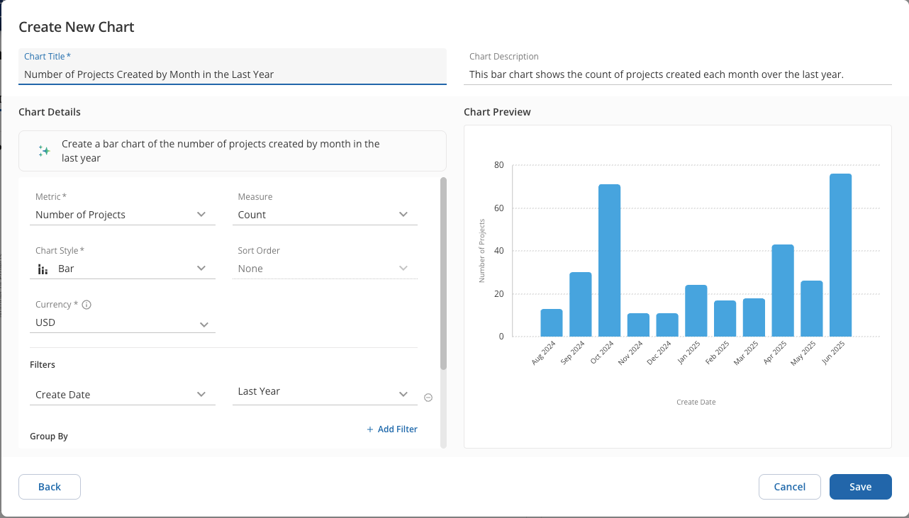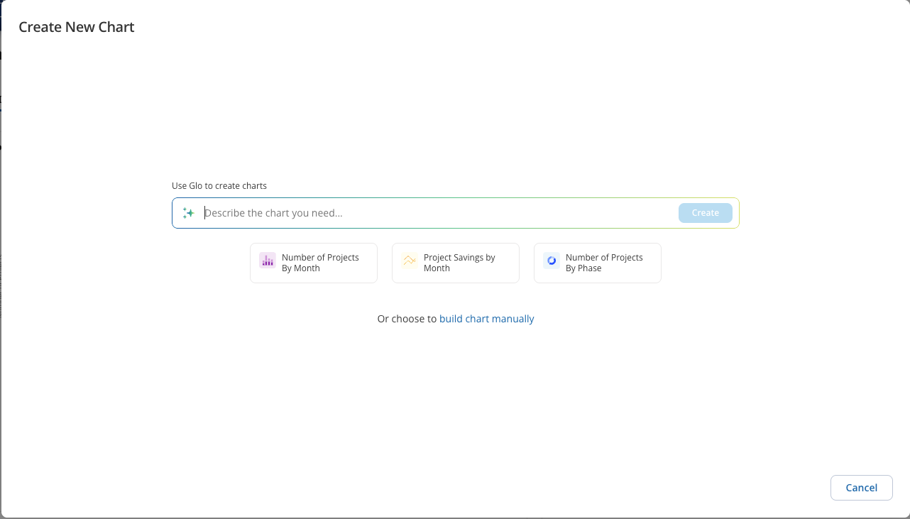 Once you begin to create a new chart, you can ask Glo to generate a chart by using natural language. Simply describe the data you are interested in and then Glo will define the chart details that are appropriate. You can modify the selections from Glo to fine tune your chart before saving. Alternatively, you can choose to create a chart manually and select all chart parameters.